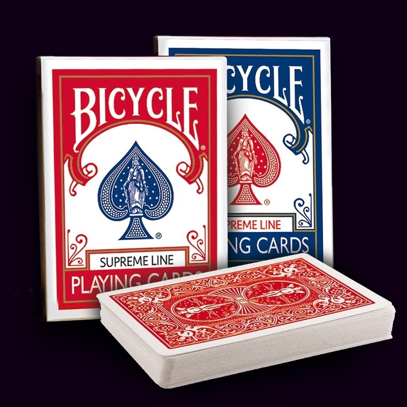 Ultima generazione delle Bicycle Rider back. Stampa su cartoncino crushed stock, un materiale più sottile e performante. Taglio tradizionale, 3 carte speciali incluse: doppio dorso, faccia bianca, falling pips. Formato poker. Stampato da USPCC. Dorso rosso